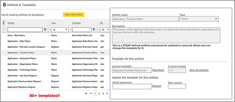 We include 80+ real-life templates for all the artifacts that have been identified by TOGAF. You can leverage these right away. Of course you can also tailor the templates to your specific needs and requirements.