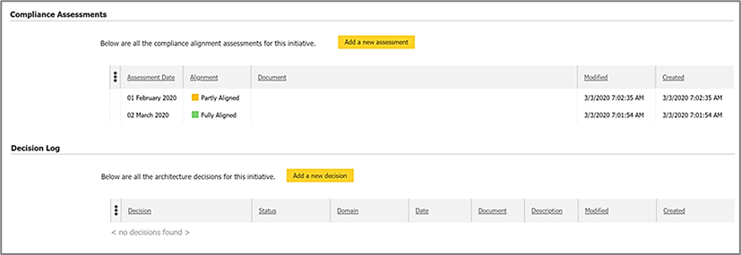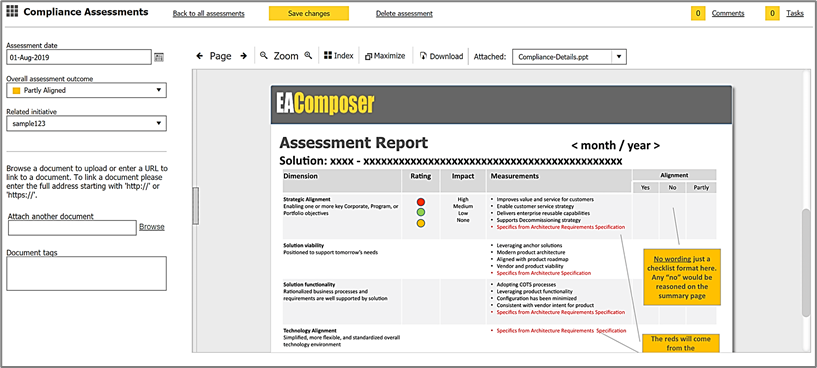 - To ensure projects and initiatives are aligned with architecture standards, roadmaps and strategies we have included a Compliance Assessment feature