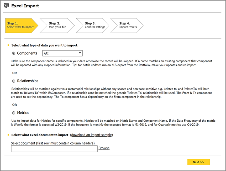Included is an Excel import wizard. A great way to upload any existing content you have into EA Composer e.g. your list of applications, servers, business functions etc. The import wizard can also be used to update components which is ideal if you want to batch update multiple components.