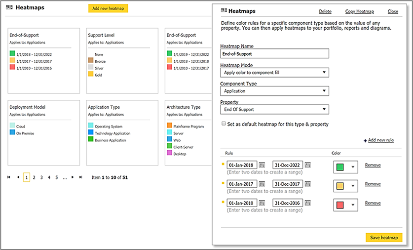Leverage 50+ out of the box heatmaps or create your own. Industry best practice heatmaps, used by most organizations, are included by default.