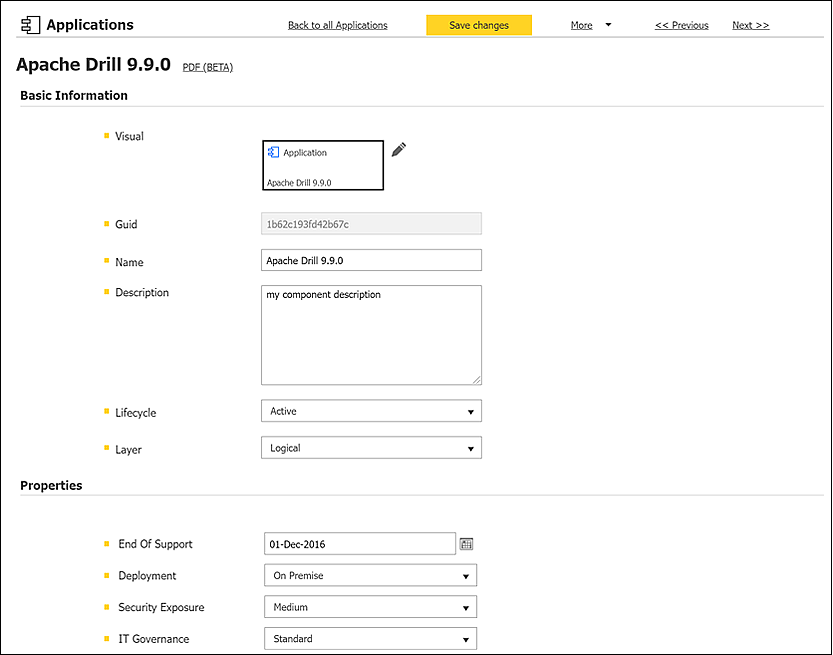 - Relationships to other assets like Applications and Interfaces