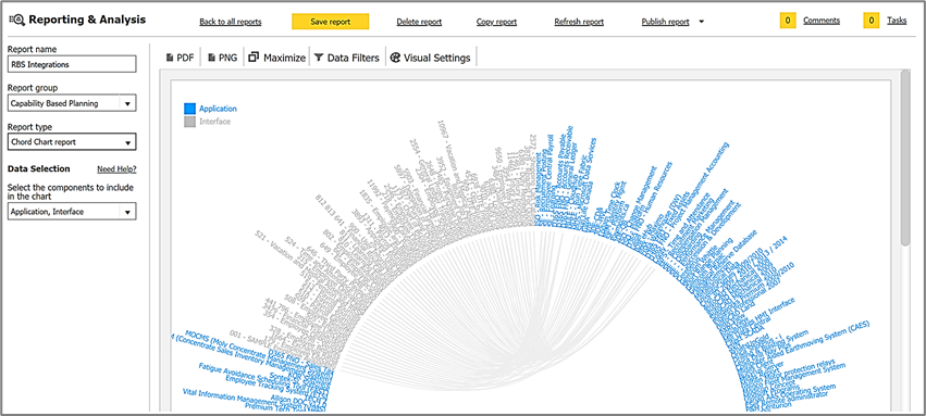 An easy-to-use reporting & analysis feature with out-of-the-box report types that you can leverage in a matter of seconds. No SQL required. 10+ different reports types and we also include 40+ actual reports all for you to leverage and start obtaining insight in your architecture. Popular report types include matrix reports, catalogs, landscape views, impact analysis, charts and more.