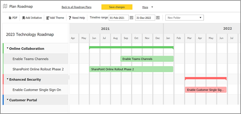 - Use color coded themes to visually group initiatives together, often to reflect a certain business outcome.